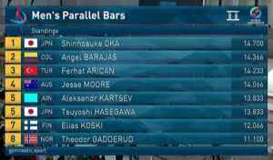 La primera presea para el atleta colombiano llegó en la final de barras paralelas, donde registró una puntuación de 14.366, resultado que le permitió quedarse con el segundo lugar. El oro fue para el japonés Shinnosuke Oka con 14.700 puntos, mientras que el turco Ferhat Arican completó el podio con el bronce.