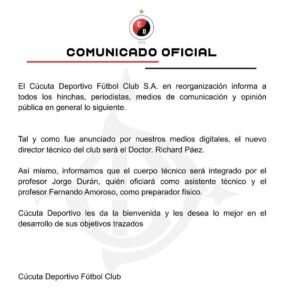 Páez, de 72 años, asume el desafío con la expectativa de consolidar un plantel más sólido y competitivo. Su llegada, acompañada de su cuerpo técnico, apunta a mejorar tanto la estructura táctica como la mentalidad de un Cúcuta que busca estabilidad en la división de honor.