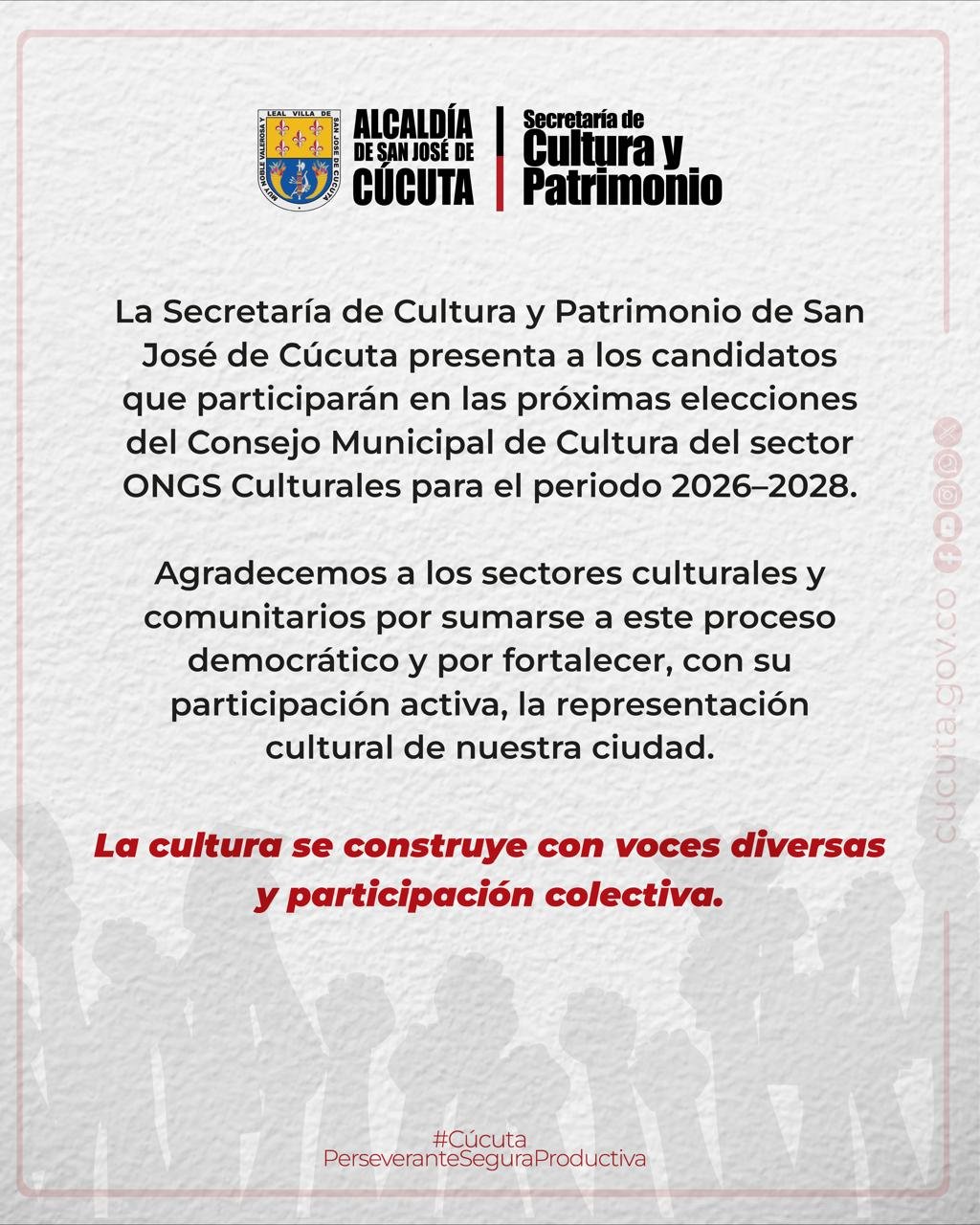 Finalmente, la administración municipal recordó que la jornada electoral se realizará el próximo jueves 12 de febrero de 2026, en el horario de 2:00 p. m. a 6:00 p. m., e invitó a todas las ONG culturales a participar activamente en este proceso de representación, clave para la construcción de políticas culturales incluyentes y participativas en la capital nortesantandereana.