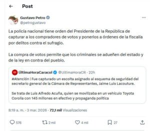 Además de instruir a la Policía a actuar contra la compra de votos, Petro también llamó a otros organismos del Estado a actuar con firmeza para asegurar la integridad de las elecciones. Entre las acciones se incluye un seguimiento estricto de transacciones financieras sospechosas durante la jornada electoral, especialmente aquellas que podrían camuflar la entrega de incentivos a los votantes.