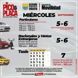 El Pico y Placa en Cúcuta Para el dia Miercoles 29 Enero: 5 y 6. “Placa Día” para nacionales y extranjeros, con horarios fijos en el área metropolitana (7:00am-8:30am, 11:30am-2:30pm, 5:30pm-7:30pm) y un horario extendido para nacionales/extranjeros (7:00am-8:00pm), según el último dígito de la placa, aplicando de lunes a viernes en un perímetro urbano específico.