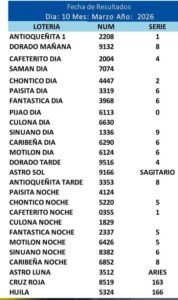 A continuación los Resultados de Las Principales loterías Jugadas el dia 10 de Marzo del 2026: