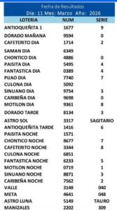 A continuación los Resultados de Las Principales loterías Jugadas el dia 11 de Marzo del 2026: