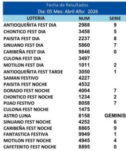 A continuación los Resultados de Las Principales loterías Jugadas el dia 5 de Abril del 2026: