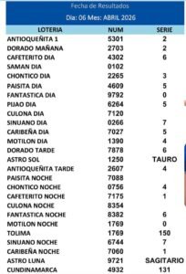 A continuación los Resultados de Las Principales loterías Jugadas el dia 6 de Abril del 2026: