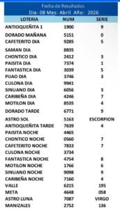 A continuación los Resultados de Las Principales loterías Jugadas el dia 8 de Abril del 2026: